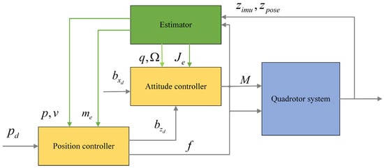Since the geometric controller heavily relies on the system model, the EKF-based parameter estimator is introduced to the control system loop to estimate system parameters online, thus enhancing the system’s robustness and control performance. Figure 2 illustrates the control scheme. The estimator calculates the state and inertial parameters of the quadrotor system online based on its inputs and outputs. In the geometric controller, the outer controller responsible for trajectory tracking computes the required thrust and the desired direction of using the position commands, estimated current state, and mass. The inner controller responsible for attitude tracking first calculates the desired attitude based on the expected directions of and . It then calculates the total torque using the state and parameter estimates from the estimator.
