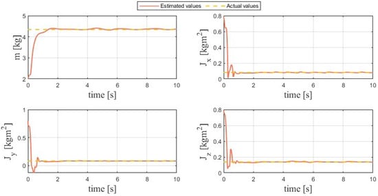 The mass and inertial matrix of the quadrotor UAV utilized in the estimator were initialized at