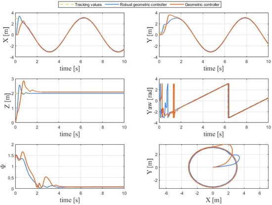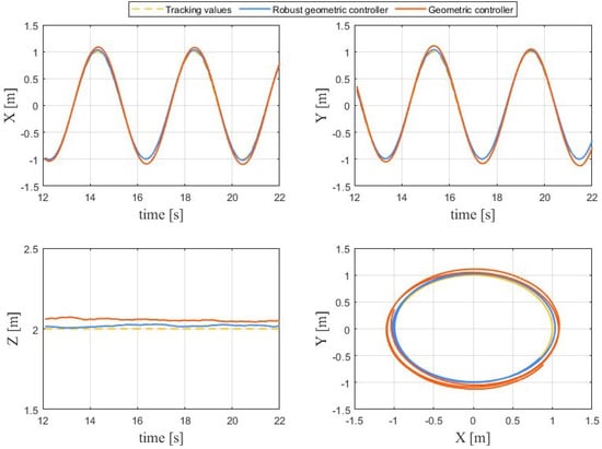 For comparison with traditional control structures, we tested the trajectory tracking performance of the proposed robust geometric controller and a traditional geometric controller [8] using the same configuration. The results are shown in Figure 4, where the dashed yellow line represents the desired value, and the solid blue and orange lines illustrate the performance of control structures with and without the estimator, respectively. During the stable phase from 4 s to 10 s, the tracking errors across the three dimensions are for the proposed robust controller and for the geometric controller alone. The root mean squared errors (RMSEs) are 0.033 m and 0.2 m, respectively.