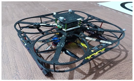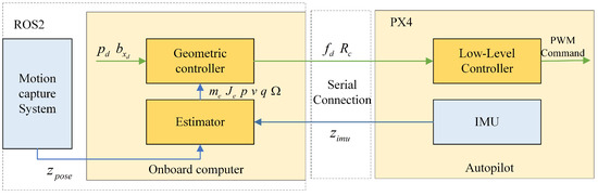 The quadrotor UAV used in experiments, as shown in Figure 5, was designed by us. The system’s architecture is illustrated in Figure 6. The quadrotor UAV is equipped with a Jetson Xavier NX (Nvidia) onboard computer and a CUAV X7 Pro autopilot (CUAV, Guangzhou, China). The geometric controller and EKF-based estimator running on the onboard computer utilize Robot Operating System 2 (ROS2) as the programming framework. The estimator utilizes the measurements from the IMU on the autopilot and the motion capture system to calculate state and parameter estimates, which are then utilized by the geometric controller. The autopilot runs the PX4 flight stack as the low-level controller, converting commands from the geometric controller into PWM signals to actuate the motors. In the quadrotor system, the onboard computer and autopilot are connected via a wired serial connection, and the pose calculated by the motion capture system is sent to the computer via a local area network.