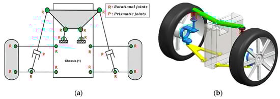 The narrow tilting vehicle (NTV) aims to prevent rollovers by allowing rotation of the vehicle body. The tilting structures proposed in many other studies are based on a double wishbone-type suspension. One of the models considered in this study is a system with a tilting structure at the top of a vehicle equipped with a double wishbone-type suspension, as shown in Figure 1a. However, considering the pros and cons of two types of suspension systems, as shown in Figure 1, the tilting mechanism concept implemented within the MacPherson strut-type suspension structure is proposed in this study. The mechanism achieves vehicle inclination through the controlled rotation of the upper strut mount. The upper plate of the suspension is attached to the axis of the tilting actuator motor, and the motor is mounted on the vehicle cabin. Applying the MacPherson strut-type method has the advantage of simplifying the structure of the tilting mechanism and reducing the vehicle weight.