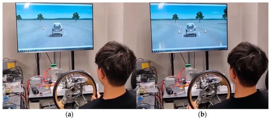 Hardware-in-the-loop simulation of the narrow vehicle: (a) normal vehicle and (b) simple tilting vehicle.