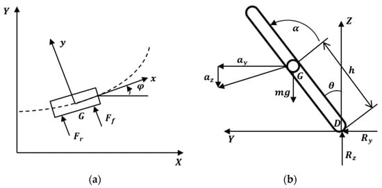 Extending this vector and performing the mathematical intersection with the ground, as illustrated in Figure 6b, we obtain the contact point. When considering the midpoint between the two wheels as the reference point, the displacement of the vehicle’s center of mass, influenced by the vehicle’s rotation, is given by a -axis position of and a -axis position of . Through this, distance from the center point of the two wheels to the ZMP can be calculated, and the formula of the ZMP is derived as follows: