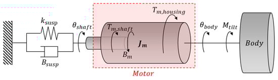 The tilting structure of the vehicle proposed in this paper is mechanically connected to a MacPherson strut-type suspension through a rotating plate. The torque generated by the tilting actuator is not directly transmitted to the vehicle’s body moment. Instead, it is configured in a complex structure of 2DOF with suspension parts and body parts. Unlike a structure where the motor is fixed at a specific position to generate torque, this system is designed to transmit torque to both the rotor and stator sides. The housing containing the motor’s stator is attached to the body, which corresponds to the sprung mass. The rotor and shaft are connected to a plate attached to the upper part of the suspension. The structure of the tilting part can be expressed as shown in Figure 4.