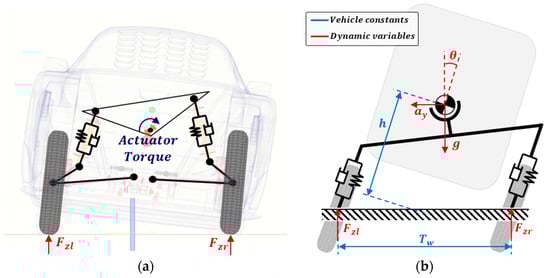 Effective roll control is not possible merely by defining and calculating vehicle stability criteria. Control logic fundamentally relies on the physical characteristics and dynamic equations of a vehicle. Therefore, a prerequisite for roll control involves a detailed analysis of the vehicle’s characteristic model and the derivation of lateral and roll dynamics. Formulas describing the lateral dynamics during cornering can be obtained through the basic vehicle dynamics equations [12]. To analyze the characteristics related to roll, derivation must be performed, and equations must include the effects of lateral motions during cornering situations. Finally, incorporating the influence of tilting actuators allows for the derivation of the roll dynamics equation. Several studies have conducted a mathematical approach to NTV, which has a structure in which an actuator attached to an unsprung mass directly applies torque to the vehicle body [3,13]. Based on the basic lateral dynamics of the vehicle, this paper provides detailed roll dynamics of a tilting structure mechanically connected to a MacPherson strut suspension rather than a structure that directly transmits drive torque.