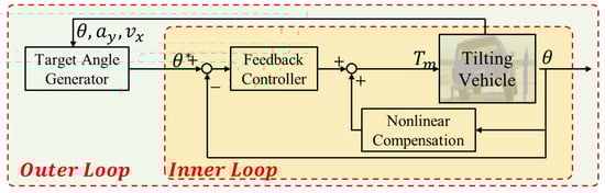 The outer control loop, which generates the target roll angle of the tilting vehicle, is based on lateral acceleration during cornering. The lateral acceleration of the vehicle’s body, originating from the center of gravity, is typically expressed as shown in Equation (19).