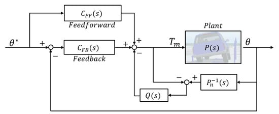 The roll angle controller of the vehicle is designed based on the dynamic model between the vehicle’s roll angle and motor torque. The relationship between the motor angle and the roll angle, previously expressed in a 2DOF, is simplified into a 1DOF rotational model. The nominal model in the control logic is expressed as simply as possible, and an additional robust controller is applied. Inertia coefficient Jn is the nominal roll inertia for the entire vehicle, while Bn is the nominal damping, such as friction from bushings and reduction gear in the vehicle. The dynamic equation of the model is expressed as follows: