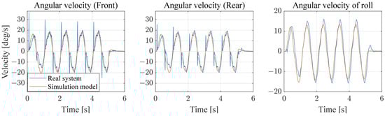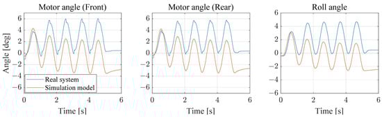 A parameter matching process is performed to ensure similarity between the simulation model and the actual model. Various sine signals of different magnitudes and frequencies are applied to perform parameter matching based on the roll angle and motor position. The parameters such as friction, inertia, and spring constant are adjusted to match the results with the actual vehicle’s behavior. The results for sine input response comparison are shown in Figure 9 and Figure 10. It is difficult to obtain the same results due to the differences between the actual vehicle and the simulation model, such as left and right friction conditions, initial position, and gear backlash. Therefore, parameter matching is performed to produce as similar behavior as possible by focusing on the phase and magnitude when various signals are given. The parameters applied in Simulink multibody are listed in Table 1.