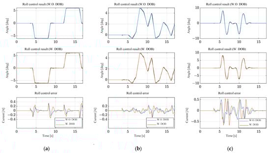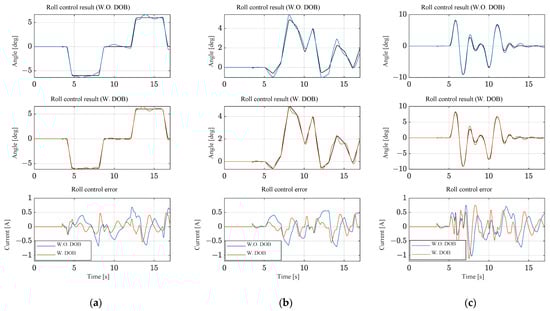 Roll angle control results without external forces: (a) trapezoidal input; (b) random input; and (c) double lane change input.