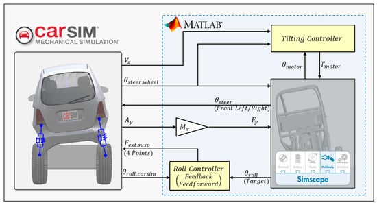 While multibody simulations are suitable for the lateral behavior in a static state, creating a dynamic driving environment is challenging. Therefore, a driving simulation tool is additionally needed, and CarSim2019 is a useful co-simulation software that can be used with Simulink. Factors such as lateral acceleration, lateral force, and driver’s steering during driving situations are imported from CarSim to multibody to generate lateral behavior. Conversely, the vehicle’s roll angle resulting from lateral behavior is imported into CarSim based on the values obtained from the multibody. The entire co-simulation environment is shown in Figure 13.