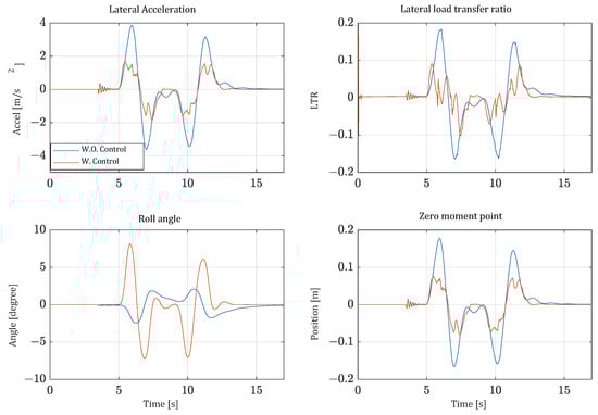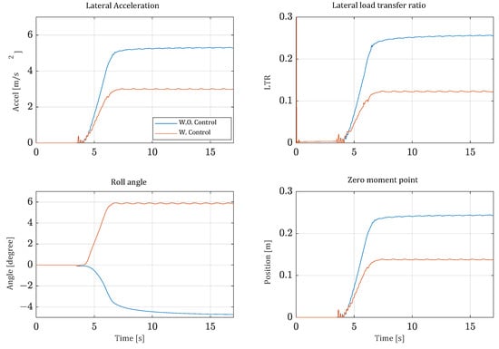 Roll stability of the vehicle is evaluated by the driver’s lateral acceleration, LTR, and ZMP. From the perspective of the roll angle of the vehicle, drivers feel safe when tilting control is applied as the vehicle leans inside of the cornering radius. In contrast, without control, the vehicle leans outward of the cornering radius, which can cause rollover. Similarly, the driver’s lateral acceleration significantly decreases when controlled, making the driver feel more stable. In terms of LTR, the roll stability is significantly reduced by more than 40% in RMS compared to the uncontrolled scenario. The increase of stability is seen in both the single lane change driving, shown in Figure 14, and the constant radius cornering driving shown in Figure 15. These results show that the lateral loads on the vehicle are well distributed, reducing the risk of one side lifting off the ground. When evaluating stability based on the ZMP, the results show that the ZMP of the vehicle with tilting control is stably positioned near the center. This indicates that the tilting control effectively contributes to stability in terms of ZMP.