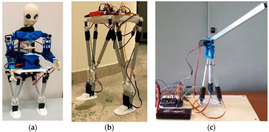 LARMbot humanoid: (a) 2018 full prototype [23,24]; (b) leg module prototype in 2020; (c) new arm prototype in 2021 [25].
