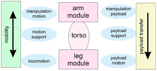 A revised consideration of the entire humanoid structure with its fundamental functional capabilities was necessary in order to define characteristic requirements for a new humanoid arm that will be integrated into the humanoid structure to ensure synergy and coordination typical for humanoid functioning. In Figure 2, the structural and functional characteristics are summarized by considering a modular structure of a humanoid with the subsystems of legs, torso, and arms that ensure the typical humanoid coordinated characteristics of manipulation and locomotion with adequate load capacity. In particular, it is indicated that the requirements and mobility characteristics of a humanoid can depend on the movement coordination of all three modules, requiring adequate proportionate design. Furthermore, it is emphasized that the load capacity of a humanoid depends on the three modules in a sequential manner; i.e., the load capacity of the arm system for manipulation depends on the support capacity of the torso and finally on the capability of the legs to support the entire structure loaded by the load. Therefore, the structure and functionality of a humanoid arm must be thought of and conditioned by the structural and functional characteristics according to the characteristics of the torso and the legs, as well as the function of the purposes designed for the entire structure.