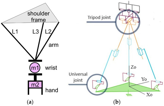 The tripod structure of the new humanoid arm for LARMbot is presented in Figure 3. In particular, Figure 3a shows the conceptual design of the arm, including the wrist joint on which a two-fingered hand is installed. The scheme also shows the respective actuators m1 and m2, which are part of the load for the tripod mechanism that is operated by the three links with linear actuators L1, L2, and L3. The fixed platform creates an attachment plate on the torso structure as the shoulder frame, while the mobile platform is created with the plate on the convergence mechanism of the three links where the m1 wrist motor is installed. The shoulder frame is designed as the base frame of the tripod architecture with a specific symmetric configuration of an equilateral triangle to facilitate the assembly configuration as a function of the main expected performance direction. The functional kinematic design is represented by the model in Figure 3, which indicates the universal-type joints for the connections of the linear actuators to the plate of the shoulder platform, the linear joints for the actuated tripod links, and finally, the convergence joint of the three links with the original three-body mechanism connected by a system of five revolute pairs, as presented in [25].