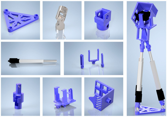 Figure 4 shows the CAD design developed for the realization of the kinematic design shown in Figure 3b, modeling commercial components for the universal joints and the linear actuators that create the tripod architecture, while the structural and support parts were modeled for manufacturing using lab 3D printing technology. These commercial components and 3D-printed parts have been selected and developed with the characteristics of low cost and easy use in both the assembly and operational functioning of the prototype. In particular, the geometries of the parts have been designed as a function of the dimensions that can ensure rigidity and solidity, as well as dimensional compactness, considering solutions that are easy to produce via 3D printer using commercial PLA.