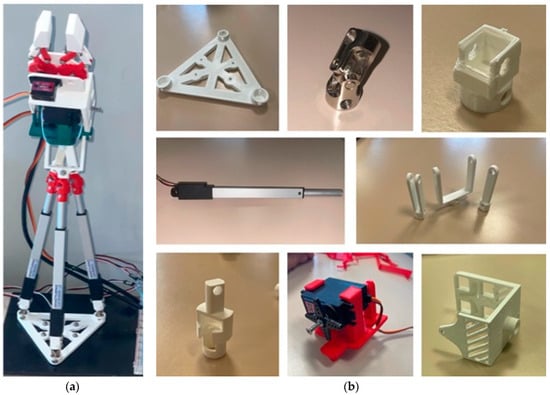 Prototype of the humanoid tripod arm of the arm shown in Figure 5: (a) full arm; (b) 3D-printed parts, and commercial linear actuators.