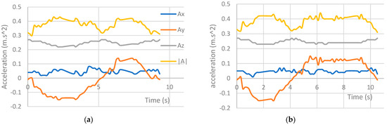 The acceleration of the plots shown in Figure 8 refers to the acceleration sensed by the IMU that is installed on the wrist. Figure 8 shows the plots of the acceleration components acquired in the two tests, which confirm the fact that the load does not seem to significantly influence the characteristics of the motion since the time evolution and the numerical values are preserved, despite encountering a certain variation in the interval between 6.0 and 8.0 s. Considering the lack of excessive speed in the movement tested in cycles of approximately 5 s, the accelerations are modest in numerical value, showing an efficient smoothness of movement of the arm in both modes.
