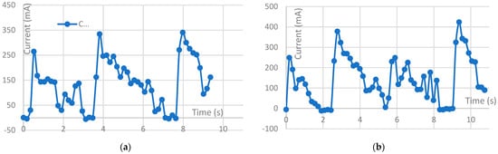 Acquired results during the test in Figure 6 in terms of current consumption: (a) without load; (b) with load.