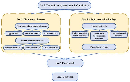 In light of the above discussion, we provide a survey of common disturbance rejection techniques for quadrotors. Section 2 describes the nonlinear dynamic model of quadrotors. Section 3 introduces two disturbance observer techniques and their variants. Section 4 discusses the application of adaptive control techniques in disturbance rejection. Section 5 proposes future work on disturbance rejection techniques. Section 6 is the conclusion of the survey. The structure of the survey is shown in Figure 1.