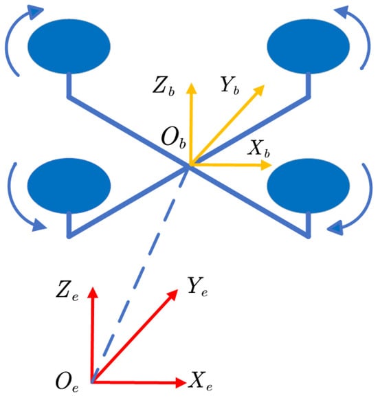 The quadrotor is a system with four inputs and six outputs. It is a strongly coupled nonlinear system with coupling between its three attitude angles and position. To describe the dynamic model of the quadrotor, two coordinate systems need to be established, which are the inertial coordinate system and the body coordinate system . The schematic diagram of the coordinate system is shown in Figure 2.
