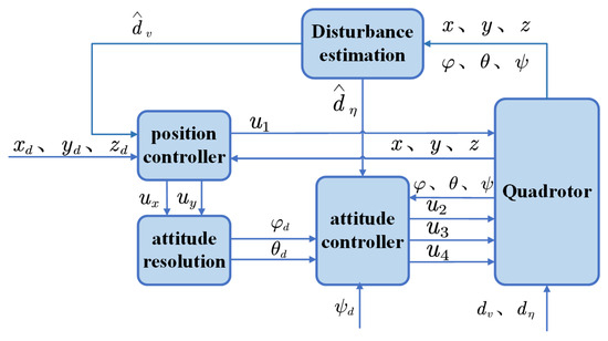 To address the underdrive and coupling issues of the quadrotor, the hierarchical control structure is commonly employed [45], as is the control block diagram in the case of disturbances, as shown in Figure 3. This paper will focus on the disturbance estimation part. The quadrotor is divided into two control loops, which are the position control loop and the attitude control loop. The position control loop is governed by a single control input , whereas the attitude loop is controlled by three control inputs , , and . The ground operator provides the desired position and yaw angle of the quadrotor, i.e., , , , and . According to Equation (3), the desired roll angle and pitch angle can be obtained through and , enabling the decoupling between the position and the attitude.