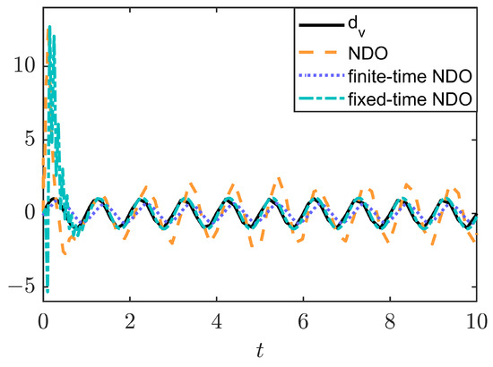 With the theoretical development, the finite-time NDO has been proposed in recent years. In [60], the finite-time control problem of a quadrotor under input saturation and external disturbances was investigated, using a finite-time NDO to estimate the external disturbances and a combination of an auxiliary system and a fast-terminal sliding mode controller for stabilization control and trajectory tracking of the quadrotor. In [61], a control scheme based on a perturbation observer and an integral sliding mode technique was proposed for spacecrafts affected by external perturbation moments and actuator failures. The scheme uses a finite-time NDO to reconstruct the composite uncertainties caused by actuator failures and external disturbances. In [62], a composite control scheme combining a finite-time NDO and adaptive non-singular fast terminal sliding mode control was proposed to cope with the problems of parameter uncertainty, external disturbances, and actuator failures. The finite-time NDO ensures that the estimation of the disturbance is completed within a finite time. This can reduce the response time of the system and enhance its dynamic performance and robustness. One of the finite-time NDO are as follows [62]: