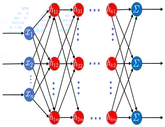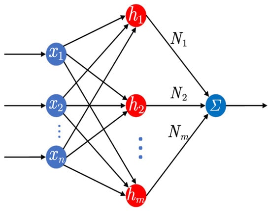 There are three types of NN discussed below. The first and most commonly used one is the radial basis function neural network (RBFNN). RBFNN has three layers, including an input layer, a hidden layer, and an output layer, as shown in Figure 6. The input layer is responsible for transferring input data to the nodes in the hidden layer. The hidden layer nodes are connected to the output layer through transfer functions, which are usually Gaussian. The output layer produces a linear combination of the input signals, and the final output data is a linear weighted sum of the hidden layer neuron outputs.