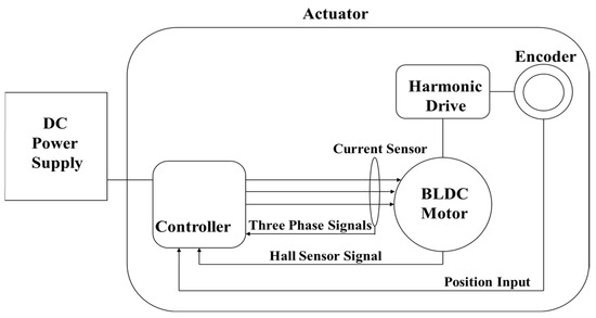 The system architecture for the actuator is illustrated in Figure 1. The actuator comprises three main components: the core BLDC motor, harmonic drive, and hall-effect sensors. The controller receives signals from the hall-effect sensors and generates corresponding three-phase signals to drive the BLDC motor. The harmonic drive, integrated with the BLDC motor, multiplies the torque while reducing the motor’s speed. The PC communicates commands to the controller, with the EPOS4 controller chosen for this evaluation. The EPOS4 controller offers control modes for position, velocity, and current, with a built-in PID for optimal and rapid responses. The core BLDC motor utilized in this actuator is a Maxon BLDC motor, which is compatible with EPOS controllers. The encoder employed is an AksiM encoder, a contactless, off-axis absolute rotary encoder featuring 16 single-turn bits. It comprises an axially magnetized hollow ring and a read-head board. Renowned for its true absolute functionalities, hollow ring design, and high operation speed, the AksiM encoder stands out as a precision device suitable for a wide array of applications.