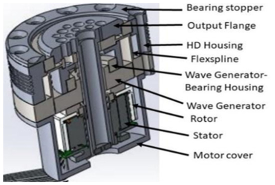 Figure 2 depicts an articulated view of the developed actuator CAD model, meticulously designed using SolidWorks. The actuator module encompasses key components such as the harmonic drive system, encoder, core motor, and various mechanical housing parts. Notably, the mechanical parts and harmonic drive system are intricately crafted to achieve a reduction in overall weight while simultaneously enhancing performance compared to existing actuators. The core principle of operation entails the amplification of input power generated by the core motor through the harmonic drive system, ultimately manifesting at the load side. Figure 3 provides a comprehensive overview of the various parts comprising the fabricated actuator module. The specifications of the harmonic drive are provided in Table 1.
