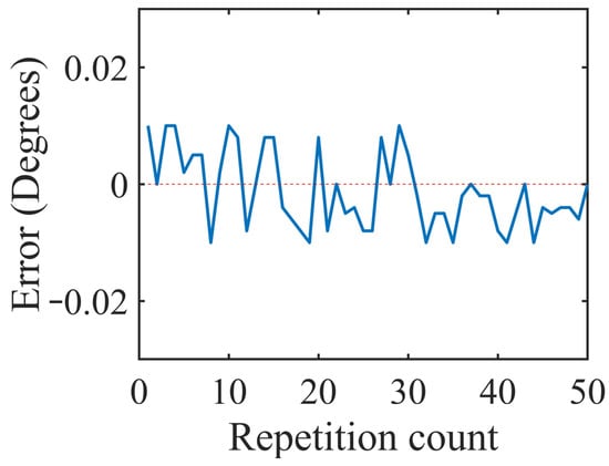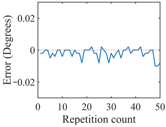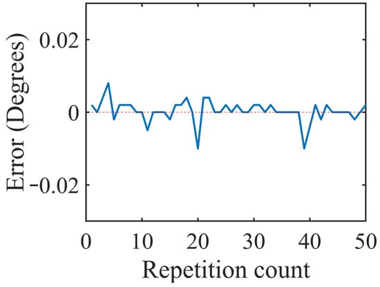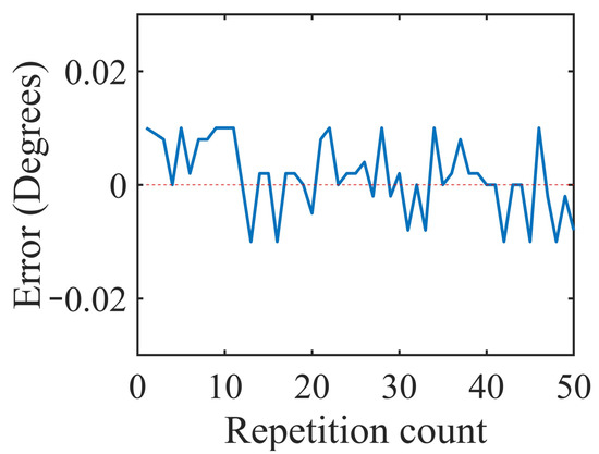 The experimental setup for the position repeatability test is depicted in Figure 7. A dial gauge was used to calculate the error in the position. For calibration, the dial gauge was arranged in such a way that when the actuator was commanded to move, the link hit the tip of the dial gauge. Then, the dial gauge scale was adjusted, and the reference was marked. The actuator moved between two particular positions, and the errors were noted. For each load, the experiment was repeated fifty times and the errors were plotted, as depicted in Figure 8, Figure 9, Figure 10 and Figure 11.