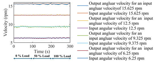 From the results of this experiment, we analyzed the deviations of the output angular velocities concerning the input angular velocities for the actuator under varying loads. The input angular velocity represented the velocity supplied to the actuator via the controller interface, while the output angular velocity denoted the instantaneous velocity of the actuator at its output. As shown in Figure 12, the angular velocities were plotted for the different loads, specifically, at 0%, 50%, and 100%. This visualization allowed us to assess how the actuator’s angular velocity responded to changes in load conditions, providing insights into its performance across different operational scenarios.