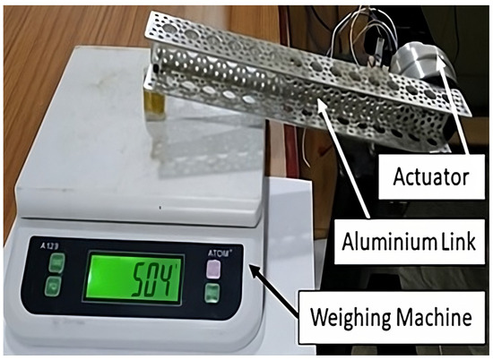 The experimental setup for the torque analysis test with a variable load is depicted in Figure 13. The torque was directly proportional to the current, and so the current was given as the input to the controller to control the output torque of the actuator. The aluminum link shown in Figure 13 was mounted to the actuator output flange. A weighing machine was used to measure the applied force by the actuator, and it was arranged as shown in Figure 13. When a specific amount of current was provided as an input to the controller, the aluminum link attached to the actuator tried to move and applied force to the weighing machine, as shown in Figure 13. This applied force varied according to the input current. This force was recorded for fifty iterations by each of the different current values. The average value for the fifty readings of force was considered for finding the practical torque provided by the actuator. Table 5 provides information about the theoretical and measured torques of the actuator and the current applied, and Table 6 provides the details of the theoretical and measured relative torques. The theoretical torque was calculated using Equation (5). We observed from Table 5 that the measured torque followed the theoretical torque, with a minimum error percentage of 1.9%.