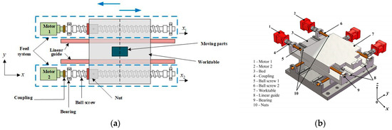 Figure 1 illustrates the twin-ball-screw drive mechanism (TBSDM) structure, showing the 2D design in (a) and the 3D design in (b), which were examined for their high-speed and precision capabilities. The dual-driven construction in the X- and Y-directions significantly enhances transmission stiffness in both feed directions. However, this study focuses on the X-direction as a case study. However, the conventional structure includes two servomotors, two ball screws, two linear guide rails, bearings, a worktable, and other components. It is well noted that the primary focus of TBSDM research is the accuracy of the worktable’s axial feed, as the axial and torsional vibrations of the two ball screws (along the X1–X2-axis) significantly impact the worktable’s axial vibration.