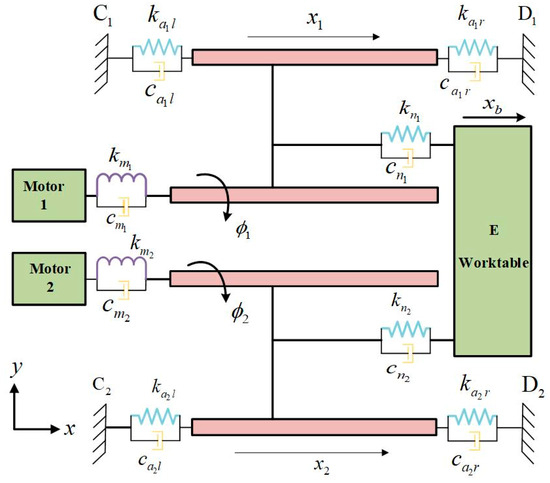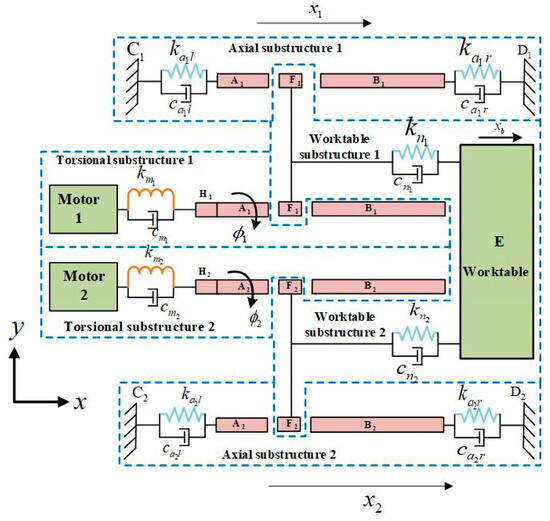 The two ball screws (BSs) are divided into segments (4 for each ball screw), A1-B1-H1-F1 and A2-B2-H2-F2, as shown in Figure 3. Segments F1-F2 represent the sections that touch the coupling BS and nut 1–nut 2, while H1-H2 describe the contact parts of the coupling BS–motor concerning the X1-axis for the first motor and X2-axis for the second motor, respectively. The segments of BSs between F1-H1 and F2-H2 are segments A1 and A2, while the rest cover segments B1 and B2. The eight segments presented above are rigidly connected; therefore, the lumped-parameter model was adopted to simulate segments A1-B1 and A2-B2 of two ball screws. The axial substructure encompasses the axial models of the ball screws (A1-B1, A2-B2) and the bearing components. The torsional substructure consists of the torsional models of the coupling A1-B1-H1 and A2-B2-H2, as well as the rotors. The worktable substructure comprises the axial–torsional models of F1-F2 and the worktable. The FRFs of the substructure can easily be derived using the finite element method (FEM). In modeling the feed drive mechanism, the FRFs of the axial–torsional substructures are independently coupled with segments F1 and F2, utilizing a similar degree of freedom.
