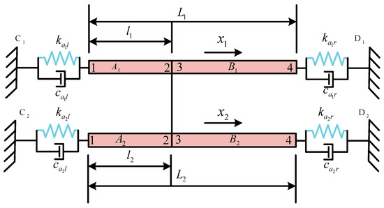 Figure 4 depicts the axial substructure model of a TBSDM. Points 1 to 4 are considered the designated locations for excitation and response to represent the FRF of the substructure. Furthermore, l1 and l2 denote the respective lengths of A1 and A2, while L1 and L2 represent the total lengths of the two different ball screws. Recall that l1 is equal to l2 and l. In addition, L1 is equal to L2 as well as L.