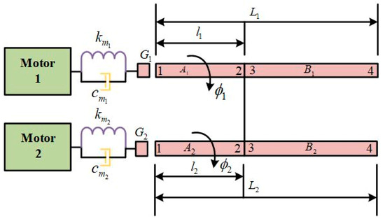 The torsional substructure model of the twin-ball-screw drive mechanism (TBSDM) is illustrated in Figure 5. The two-ball-screw model is considered symmetric in this paper; therefore, position l1 is equal to l2 and can be replaced by l, and L1 is equal to L2 and can be replaced by L.