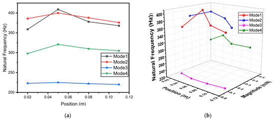 Effect of worktable position on dynamic properties of 4 modes: (a) position vs. natural frequency, (b) position vs. natural frequency with magnitude.