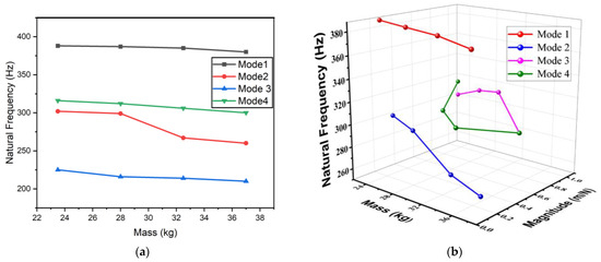 The worktable mass effect on the dynamic properties of the TBSDM is studied in this part since worktable mass is among the parameters to account for the TBSDM designing process. To determine the influence of worktable mass on the entire system, as shown in Table 4 and Table 5, we configured our machine with four different masses at the initial position (l1 = 0.002 m). First, we calculated the natural frequencies in our four modes at the initial worktable mass of M0 = 23.5 kg in the initial position (l1 = 0.02), and secondly, we added three external masses, as shown in Figure 6, to vary the worktable mass. The second worktable mass was M1 = 28 kg, the third one was M2 = 32.5 kg, and the last one was M3 = 37 kg. It is noted that the change in worktable mass was observed at the initial worktable position l1 = 0.002. The measured natural frequency and its corresponding magnitude were recorded and are plotted in Figure 8. The effect of changing worktable mass on the dynamics of the TBFDM was subsequently analyzed, as shown in Figure 8a, considering the variation in natural frequency vs. the change in mass in all modes. Figure 8b describes the same effect considering each mode’s magnitude. It was found that an increase in mass caused a decrease in natural frequency in all modes, but the highest change rate was observed in the curves of mode 2 and mode 3. Figure 8b shows that the increase in mass has a higher magnitude in mode 3 and mode 4 than in the first and second modes. Therefore, this research can confidently conclude that the variation in worktable mass significantly affects the coupling ball-screw–bearing (mode 2) and ball-screw–motor (mode 3) since the change in worktable mass has a negligible effect on the axial (mode 1) and rotational vibrations (mode 4) of the ball screws themselves.