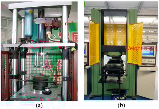Air suspension is a form of suspension that is commonly selected for high-end commercial vehicles. Compared with other commonly used types of suspension, it contains air springs in the assembly, so it has the advantages of adjustable and controllable stiffness, a lower natural frequency, and good vibration and sound insulation, which enables vehicles loaded with air springs to offer a better riding experience and improved driving quality []. The research and development of air springs in China is at a relatively early stage. However, it is worth noting that due to the state of development of relevant production technologies in the automobile industry, especially the shortcomings of rubber synthetic materials related to air springs, the mass production of domestic air springs is still in its infancy []. A large number of researchers have performed the mathematical modeling of air springs using computer numerical analysis software [,] and have analyzed the inherent characteristics of air springs with the help of finite element simulation software [,]. However, the performance of air springs is affected by multiple factors, such as the synthetic materials used, the production processes and the production batches []. In the actual production process, the designed air spring requires a large number of tests to determine the practical performance of the air spring with the help of relevant test equipment after trial production. In the course of testing, a key issue is the application of the simulated load. Under the loading condition of the air spring, the load comes from the car body and other related spring equipment, and the load is constant but the value is large. At present, scholars and manufacturers often use hydraulic cylinders or electric cylinders as the active load in equipment design [,], which need to be equipped with a perfect energy and control system, involving a complex structure. Alternatively, large mass blocks can be used to simulate body loading [], which results in the overall equipment being heavy, as shown in Figure 1. Accordingly, it would be of value to design a kind of test equipment which can increase the load but with a reduced volume.
