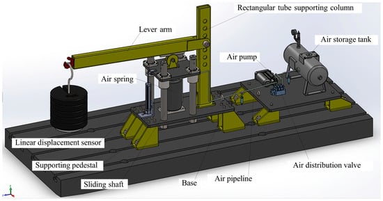 According to the pre-set test function, a special lever-type torque-loaded dynamic and static performance test device for air springs is designed. The design of our test device roughly includes test equipment mechanical system design and measurement and control system design. The mechanical part of the test equipment applies a load via lever-type torque loading and installs the air spring between the upper and lower baffles, featuring a linear bearing with a sliding fit on the sliding shaft to realize the elongation and compression of the air spring during the charging and discharging process. An air pump, air storage tank and air distribution valve in the test equipment are adopted to provide compressed air for the air spring. The state of the air spring in the test is detected by the force sensor, height sensor and air pressure sensor and transmitted to the host computer software in real time via CAN communication. The upper computer control system outputs the air distribution valve control signal to control the air spring according to the control strategy adopted. As shown in Figure 3—the mechanical structure assembly drawing—the devices and layout methods used in this test equipment completely reproduce the suspension layout of some passenger cars using air springs at present, enabling us to complete an air spring characteristic test, an adjustable loading charging and discharging test and various verification tests under different control strategies.