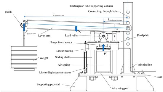 Based on the weighing principle of the Chinese scale, special test equipment which can apply the lever ratio magnifying load to the test air spring is designed [], as shown in Figure 4. This figure demonstrates load assembly and the load platform, which is basically composed of a bottom plate, a support column, a load transverse arm and the load weight, and the bottom plate is fixedly connected to the cast iron platform by T-shaped bolts, playing a supporting role. The supporting column adopts a rectangular pipe structure and is fixedly connected to the equipment base plate by bolts, and the upper end of the supporting column is provided with connecting through-holes of different heights to connect the lever arm. One end of the utility model is hinged to the connecting through-hole of the supporting column, and the other end can be loaded with different load weights. A load roller is fixed under the lever arm, and the vertical force above the roof is always maintained by the load roller. The upper roof of the load has a vertical sliding shaft as the horizontal limit and the support releases the vertical degrees of freedom at the same time, which ensures that the air spring can stretch freely longitudinally under the load. This design enables our test equipment to amplify the load applied on the air spring using the lever principle, thus effectively analyzing and verifying the working characteristics of the air spring.