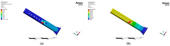 According to the actual working conditions and the test requirements of the air spring, the maximum load of a single air spring is about 800 kg. Considering that the lever ratio of the lever arm is 1:4, the vertical load applied at the hook is 2000 N. The maximum equivalent stress and maximum deformation of the static characteristics are shown in Figure 2. According to Figure 5a, the maximum stress of the lever arm is 76.536 MPa, which is much less than the yield stress (235 MPa) of ordinary carbon steel used in the lever arm, indicating that the strength of the lever arm meets the requirements, including the safety and availability requirements. According to Figure 5b, the maximum deformation of the lever arm is 0.30034 mm; the amount of deformation is almost negligible and the maximum deformation appears at the hook. In addition, from the hook of the lever arm to the connecting hole, the deformation gradually decreases until it is reduced to 0 mm, indicating that the lever arm satisfies the strength requirements.