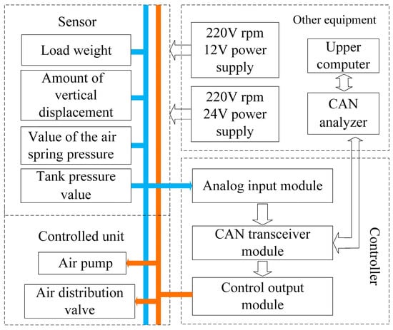 The measurement and control system mainly consists of test equipment for measurements and control. The system components include sensors, controlled units, controllers, power supplies, computers (host computers), CAN analyzers, etc. The measurement and control system architecture is shown in Figure 8.