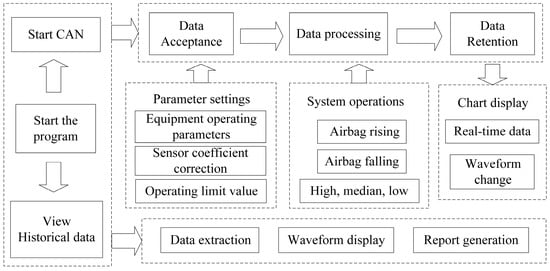 The host computer software was specifically designed for the test platform, and the functional modules include serial communication, data acquisition and processing, data saving, parameter setting, chart display, historical data viewing and so on, as shown in Figure 9. After starting the program, CAN communication is activated by the loop main program of the serial communication module. There are corresponding Boolean control prompts to determine whether communication is activated and whether the data can be sent. Then, the required message data are filtered according to the ID information of sending and receiving messages, and then the message is converted from hexadecimal to decimal and hexadecimal to binary by calling the sub-VI program. The received data are then processed by the parameter setting module, which can display the sensor measurement data of the test equipment and the opening and closing of pumps and distribution valves in real time. Then, the test equipment performs the charging and discharging action according to the test requirements, and the host computer can display the changes in the data waveform and store data in real time. The program framework of the function module of the host computer will be introduced in detail below.