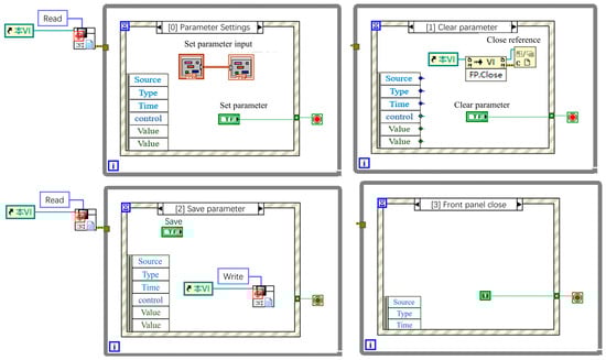 The parameter setting module adopts the mode of event structure plus main loop and saves the parameters with the help of parameter read-write sub-VI. The data are saved in the form of a configuration settings (.ini) file. After opening the front panel, the parameter data are automatically extracted and displayed from the configuration settings file; one must click to save the parameter front panel data into the file. The specific program block diagram is shown in Figure 10.