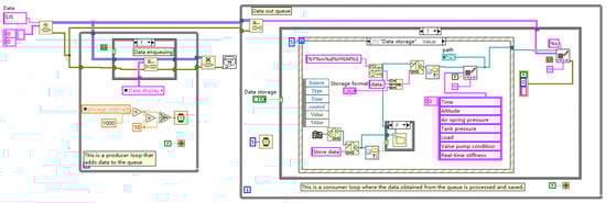 The producer and consumer model in Labview provides a more flexible design process. This mode can not only process data quickly and stably, but also avoid data loss caused by speed mismatch between data acquisition and data processing by making use of the first-in-first-out characteristics of data in the queue []. The data storage function part uses this mode to build the program block diagram, as shown in the figure. This mode consists of two parts: the producer loop, which is responsible for adding the real-time data displayed on the front panel to the queue according to the set number of samples per second, and the consumer loop, which is responsible for extracting, processing and saving the data in the queue. There is a fixed storage path for writing in the consumer loop, and two storage formats, CSV and TXT, are available. The specific program block diagram is shown in Figure 11.