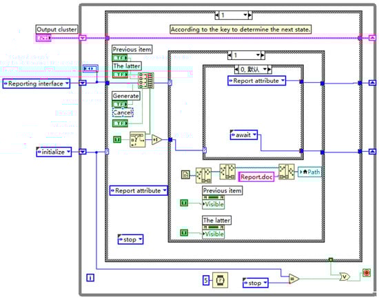 In general, the historical data extraction module mainly includes the functions of early test data fetching, waveform analysis and report generation. This module focuses on introducing the report generation function. The report generation function has a report display interface on the front panel, including the title, test time, test personnel, test overview, test flow and the curve of the extracted data and other parameter settings. The report generation button is selected to generate a word report automatically. The program implementation of this function was designed by a state machine. According to the pre-set commands, the program is divided into five different states, including initialization, waiting, bundling parameters, generation and stop []. The specific program block diagram is shown in Figure 12.