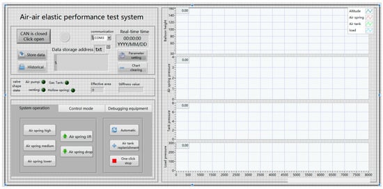 The parameters that can be set in the system include the working parameters, the parameters of measurement and correction, and the allowable limit. The data are accurately output and displayed in the form of setting parameters in order to achieve the best test effect. The working parameters include the simulated height position of the air spring and the maximum and minimum pressure of the air storage tank during charging and discharging. The correction coefficient of inspection and measurement indicates if there is an error between the output value of the sensor and the actual value affected by the environment. A range of actual pressure values and analog voltage values are measured via physical measuring instruments and multimeters, and then the measured data are fitted in the form of y = ax + b so as to determine the values of a and b and re-calibrate the data. The allowable limit value refers to the maximum operating limit value during operation. After exceeding this limit, the equipment will stop working and there will be an associated Boolean flashing warning.