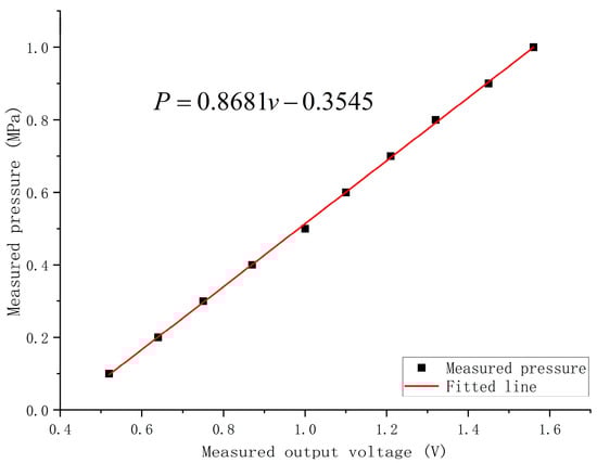 Before the formal experiment, the load cell and pressure sensor were calibrated. Taking the pressure sensor on the air spring side as an example, this pressure sensor is mainly responsible for collecting the pressure data of the air spring. It needs to be calibrated and verified for accuracy to ensure the accuracy of the pressure value collected. According to the calibration data provided in the pressure sensor manual, the relationship between the sensor output voltage and the air pressure is: