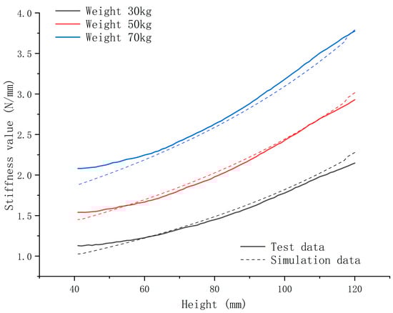 The change in the air spring rate value with height is obtained by processing the test data and the simulation data, as shown in Figure 19. Obviously, the elongation and compression of the air spring are within the stroke range. The test data of 30 kg, 50 kg and 70 kg loaded weights are consistent with the simulation data, indicating that the simulation in AMESim software is in line with the actual situation and the equipment meets the requirements of the test. According to the analysis of multiple sets of data, the main reason for the error is that the effective area of the air spring changes greatly in the actual working conditions, while the effective area change rate of the air spring in the simulation does not change by default. In addition, it is possible that the mechanical vibration during inflation and deflation has an effect on the detection of the actual value of the air spring, resulting in distortion of the collected data.